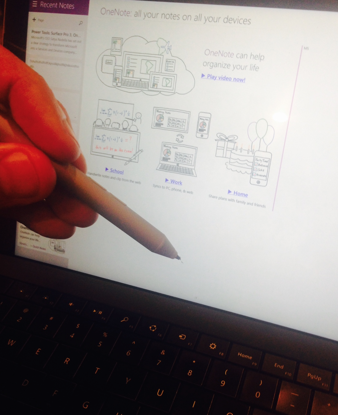 The touch screen combined with Microsoft smart stylus (pen) and OneNote, makes the Surface a brilliant note taking tool. I can sketch up screen layouts and scribble down notes without paper. Now I have my notes with me anywhere I go rather than in a serious of paper note books and scraps of paper on my desk.