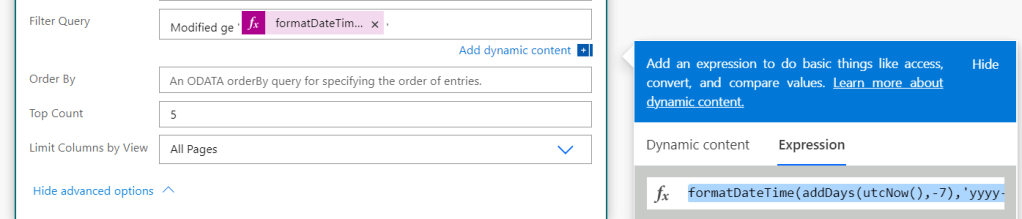 8. Chris – thank you! I tried this and get an error caused by the Filter Query value of formatDateTime(addDays(utcNow(),-7),’yyyy-MM-ddThh:mm:ssZ’) — any thoughts on how to fix? thank you!
