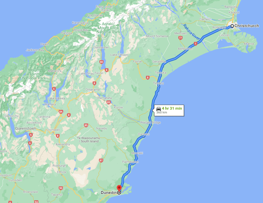 I booked a couple of nights at the Scenic Hotel Dunedin (one of two hotels in Dunedin listed as having Tesla destination chargers). The distance from my driveway to the Hotel is 368km’s, so well within the range indicated by Tesla. The trip starts with 20 mins of urban driving, followed by motorway and state highways before a short urban drive into the hotel. The last hour of the drive has hills including a couple of big ones as you reach the outskirts of Dunedin. It was a hot day, so the air-conditioning was on for the entire trip down.