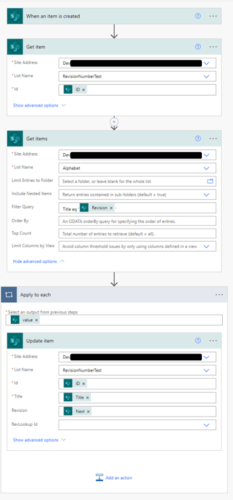 The Update Item action is inside a loop, but will only run once if the Title column is unique. In this case it updates a List item and sets the Revision to the next value, each time the Flow runs.