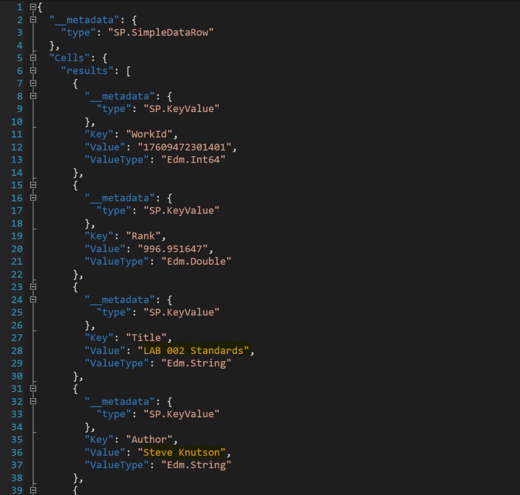 The Uri value is the API request including the querytext. In this example I am searching for documents containing the search term “LAB” where the filetype is .DOCX.
