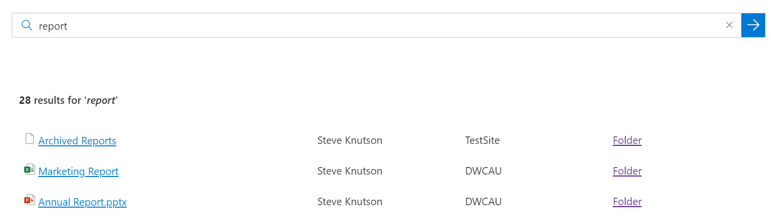 In the result webpart above, I have customised the result layout, adding the Author, Site Title and a link to the folder where the result document is stored.