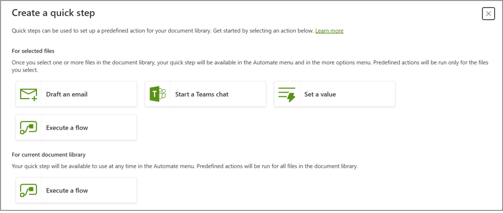 Other actions allow you to start a Teams chat with a person, set metadata values or start a Flow for the selected documents. You can also use Quick Steps to start a workflow that will run against all documents in a library.