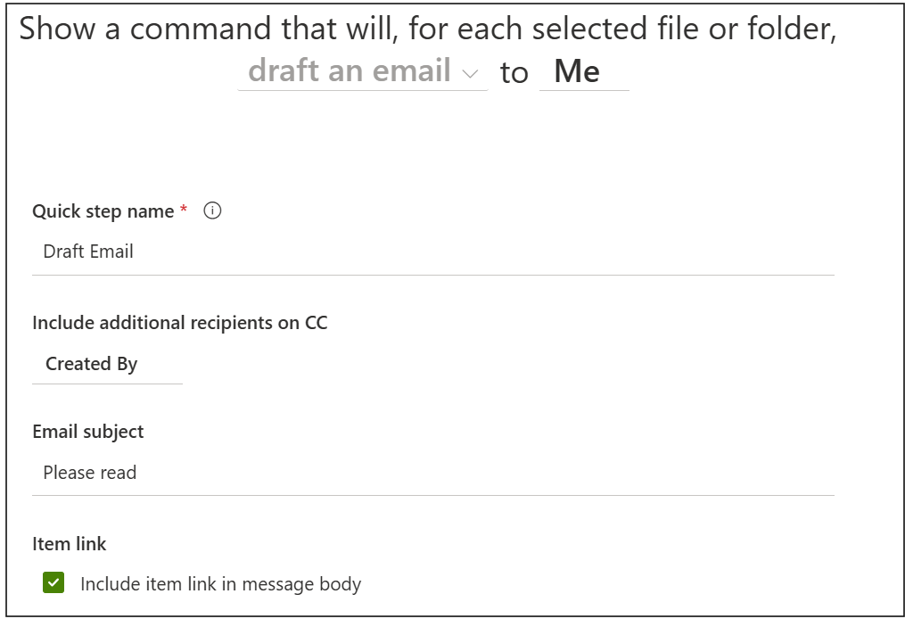 Follow the wizard to create the Quick Step and fill in the various values in the template. In the example below and email with a Link to the selected document is sent to me and the email is CC’d to the person who created the document.