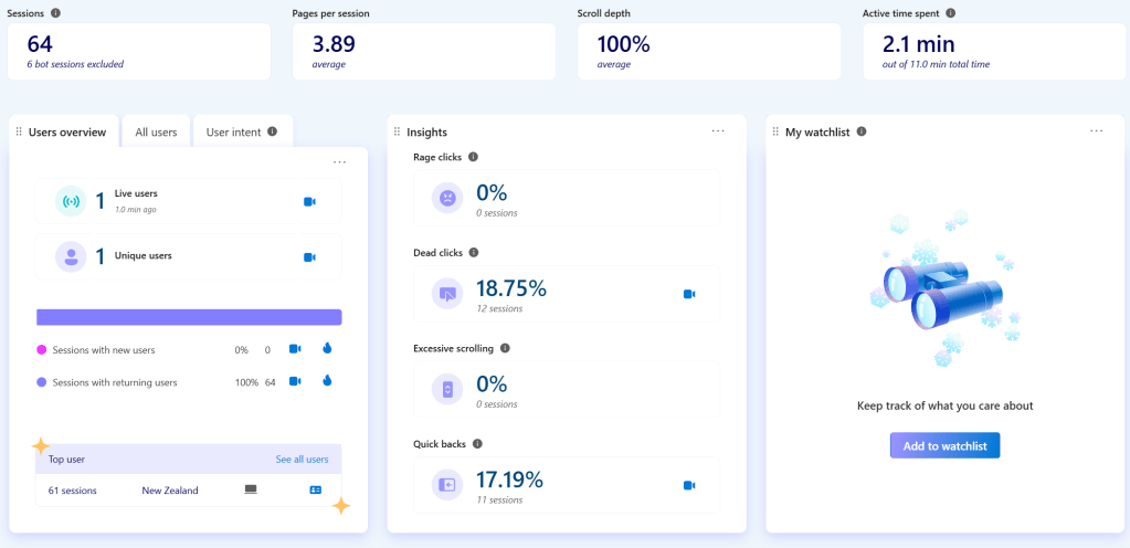 The Dashboard gives an overview of user activity including click and scrolling behaviour. I love the “rage clicks” count as I can picture someone madly clicking trying to get something done and becoming more enraged as the Intranet page fails them! Also see the “excessive scrolling” and “quick back” behaviour measures.