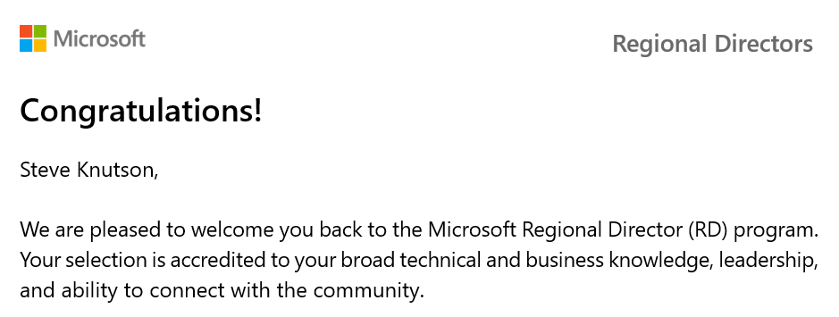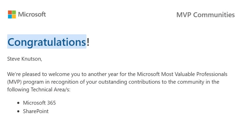 I checked my email at 5am Friday morning to see the good news that I was accepted as a Microsoft 365 and SharePoint MVP, two hours later I received another email to say I had also been accepted into the Microsoft Regional Director (RD) programme for the second time.