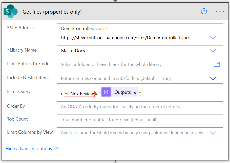 Note the OData Query Filter includes the column name containing a date. This will need to be updated to match the internal field name used in your Document Library.