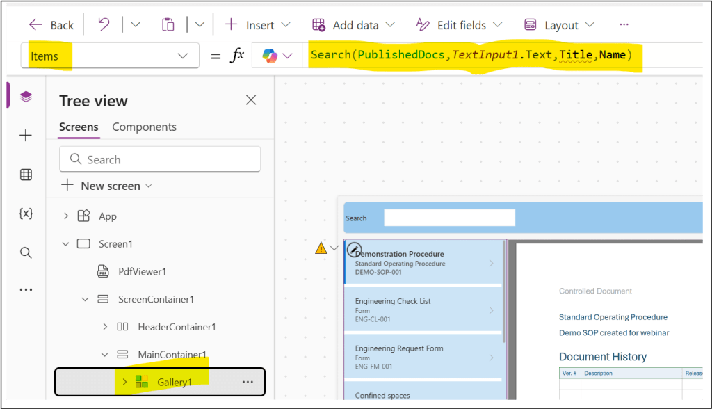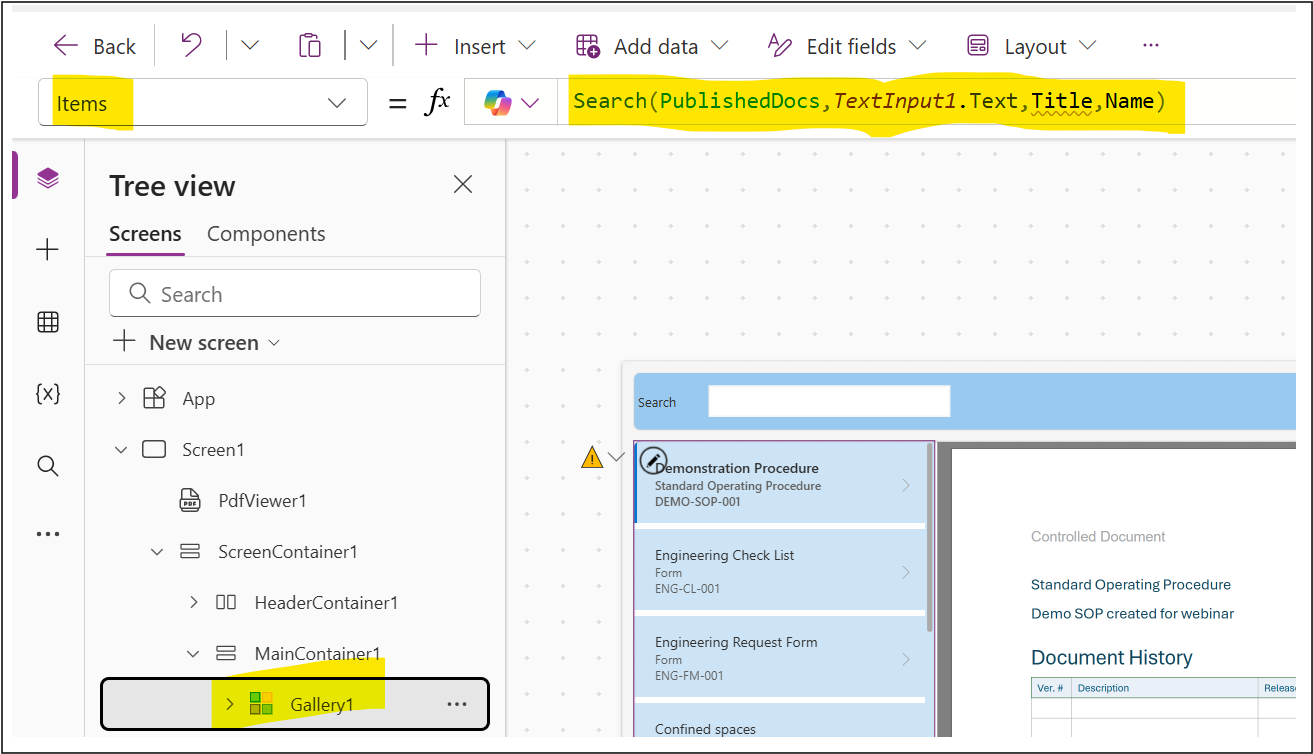 - Configure the Items property on the Gallery to use this function (Title and Name are metadata fields in the gallery):