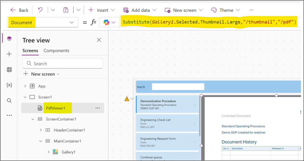 - Substitute(Gallery1.Selected.Thumbnail.Large,”/thumbnail”,”/pdf”)