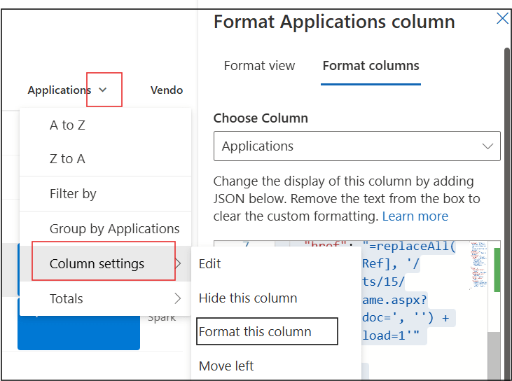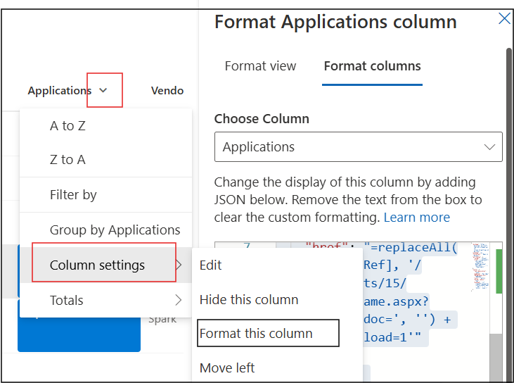 - Choose the down arrow next to the Column name > Column Settings > Format Column.