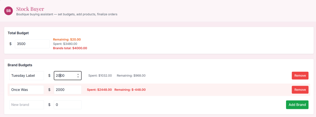 In the budget section can you default the budget to $5000 and display a $ sign.I like the look of www.darcyboutique.co.nz can you theme the app so it is similar?In the add a product section can you include a month drop down list populated with month names. I noticed the fonts in the Brand Budget section are different sizes can you make them the same as other sections?After that update I get an error <paste error code>Can you add some conditional formatting if the budget is > 90% used make the colour orange. If it is over budget make it red.